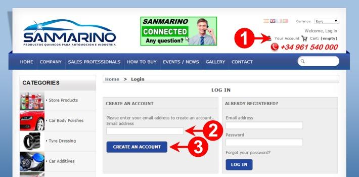 1 - Il est nécessaire d'avoir créé un compte sur notre site web "www.limpiarcoche.com". Si vous n'en avez pas, vous pouvez le créer facilement en cliquant sur "Votre compte" situé en haut à droite.