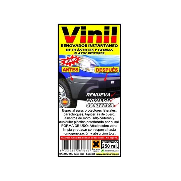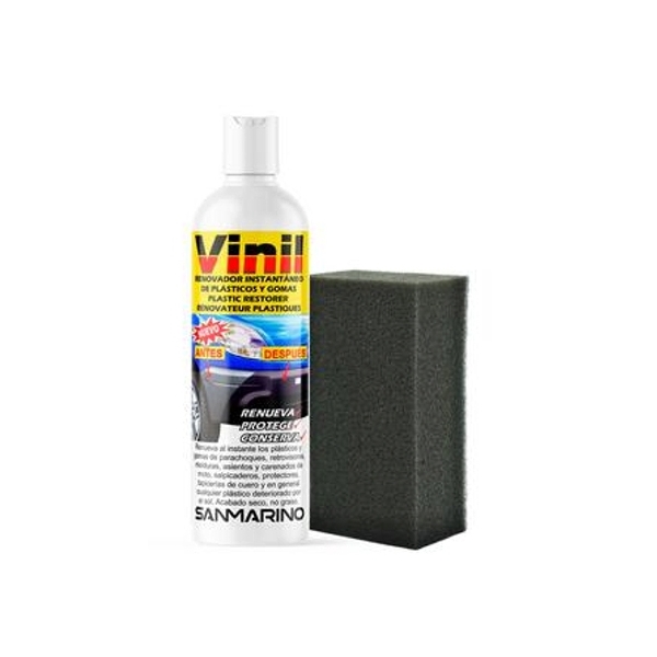 Renewing product that creates a brilliant, transparent, and protective veil, which adheres tenaciously to the treated parts, instantly renewing any fiberglass surface (side panels, and others), plastic (discolored and damaged by prolonged exposure to sunlight), and any rubber part.