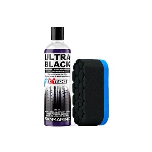ABRILHANTADOR PNEUS E PLÁSTICOS ULTRA BLACK + ESPONJA TÉCNICA 250 ML.